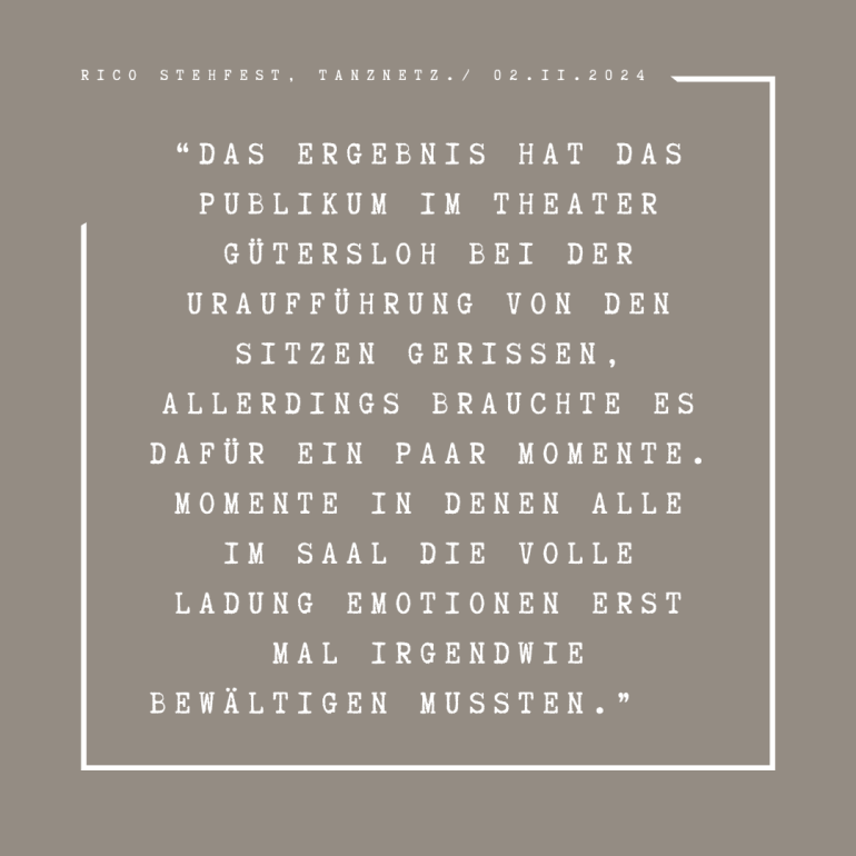 In Same Love, prejudices in the context of love and relationships are critically questioned and challenges are presented through dance. The piece invites the audience to reflect on the acceptance, tolerance and diversity of love. Stereotypes are broken, gender roles are questioned and different forms of love are represented. The diversity of human experiences is celebrated and the political dimension of love is made visible. The audience experiences a performance that encourages rethinking, critically reflects on social norms and presents alternative perspectives on love. The essence of the piece lies in the portrayal of personal experiences and the communication of a message of empowerment that enables the audience to embark on an emotional journey. In the impressive finale, all the dancers unite to make a powerful political statement for empowerment.